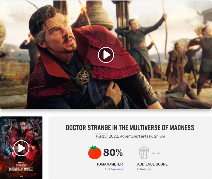 “Doctor Strange1”: 89% on Rotten Tomatoes, with an average score of 7.3. MTC Comprehensive Review 72.
