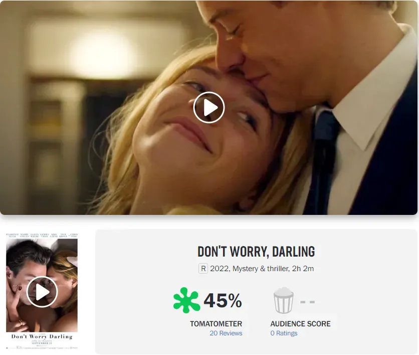 Currently ‘Don’t Worry Darling’ is 45% fresh on Rotten Tomatoes (19 reviews 8 fresh and 11 bad), and MTC is 49 (21 reviews 5 good, 16 medium and 0 bad).