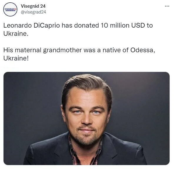 Leonardo DiCaprio donated $10 million to Ukraine, Visegrád 24, a Czech, Slovak, Polish and Hungarian partnership, said on social media recently.