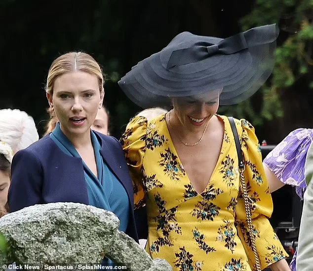 Scarlett Johansson’s new film “The Sea Change” has revealed roadside photos of Scarlett and Sienna Miller among the guests, Scarlett in a light blue belted dress and dark blue jacket, and “The Sea Change” in a yellow floral satin dress.