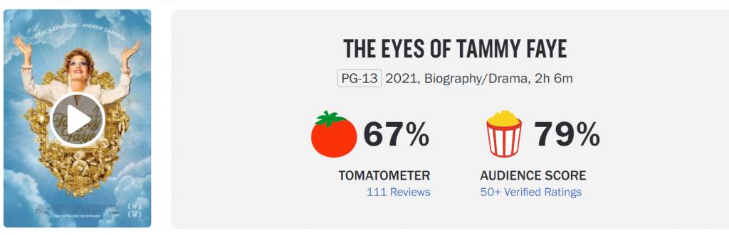 Another awards season movie “The Eyes of Tammy Faye” was released in 600 theaters, ranked 9th at $675,000, and Rotten Tomatoes 67%.