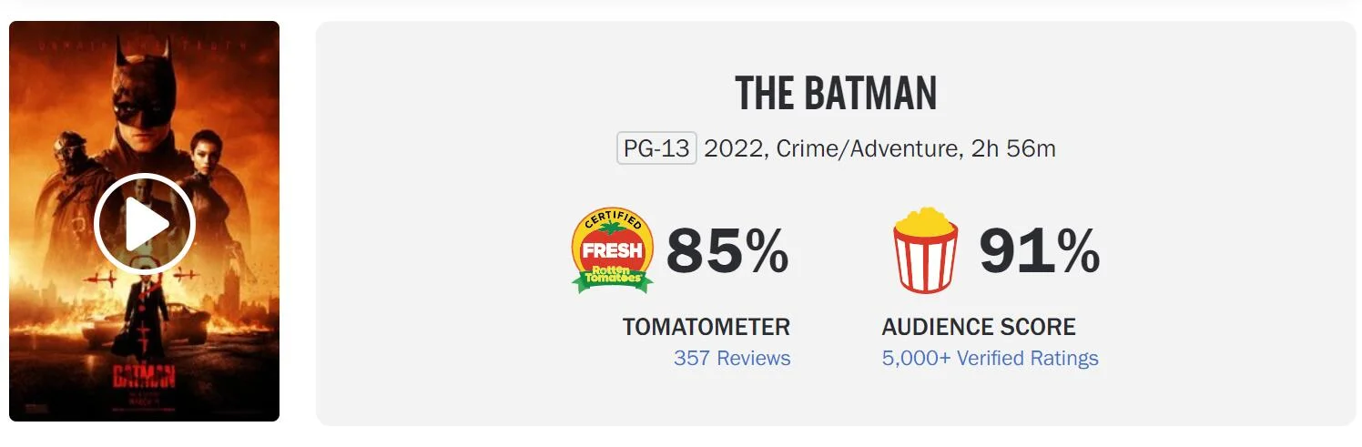 In terms of word of mouth, “The Batman” has a CinemaScore score of A-, 85% freshness on Rotten Tomatoes, 91% audience popcorn index, and IMDb 8.6 points.