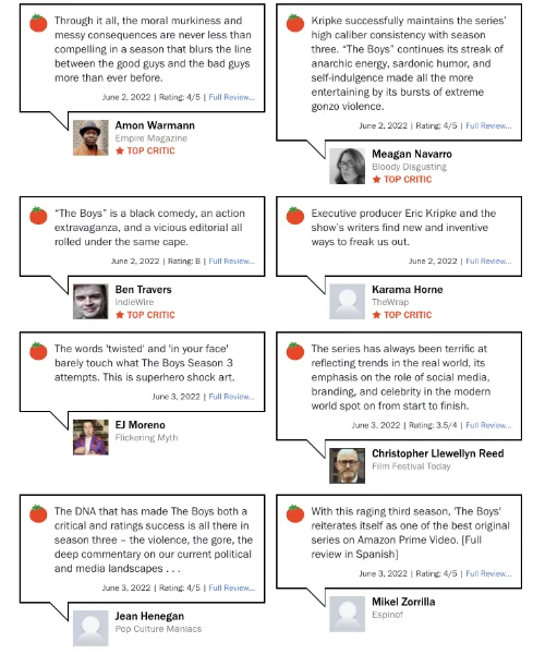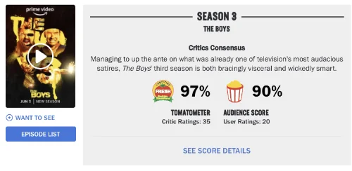 “The Boys Season 3” is now available on Amazon Prime Video, and the show’s reputation on Rotten Tomatoes has been lifted: 97% fresh and 90% popcorn.