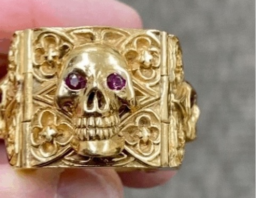In the photo, he is holding a ring with a skull sculpture and eyes with purple gems.