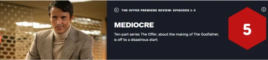 The media evaluation of the biographical drama “The Offer” featuring the producer of “The Godfather” has been lifted, and IGN gave “The Offer” a 5-point rating.
