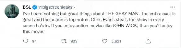 According to the news, the new spy action film “The Gray Man” directed by the Russo Brothers has recently held a preview, and the response is not bad.