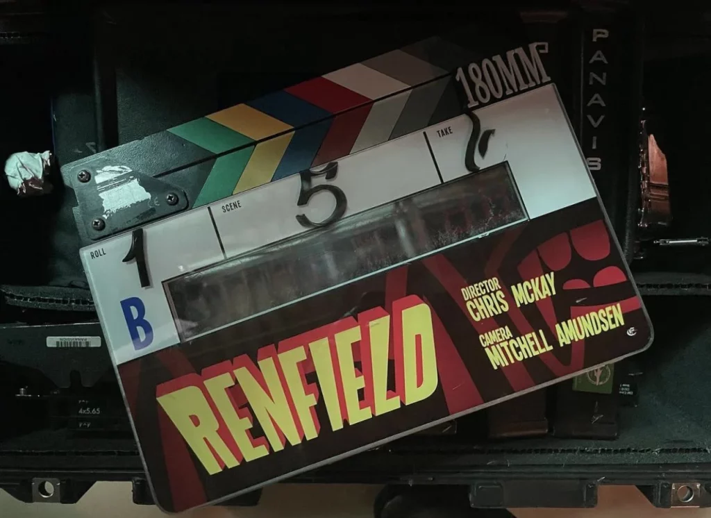 On the set photo, is a board beater with the title of “Renfield” written on it, along with the names of the director and cameraman.